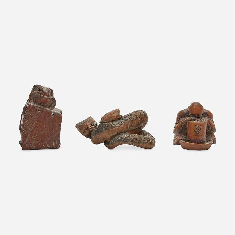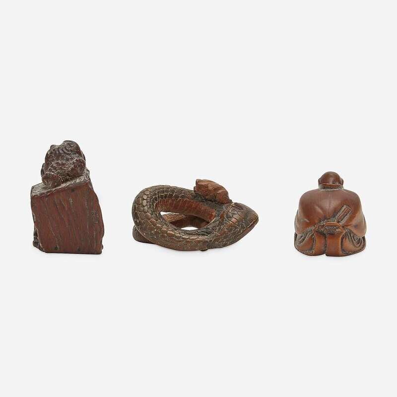 The first depicting a toad resting on a measure, signed Gyokukazu; the second a coiled snake with a toad resting upon its back, signed to its underside; the third unsigned (3).