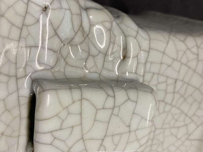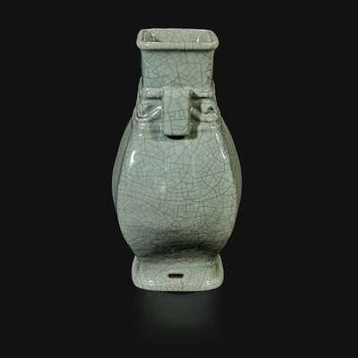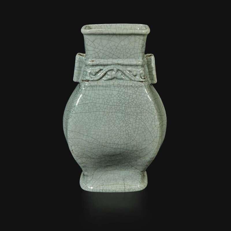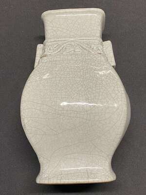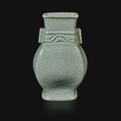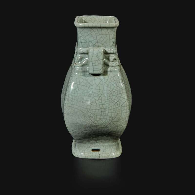 The body of rectangular section and decorated in a pale greenish-grey crackled glaze, flanked by a pair of lug handles at the neck, a sinuous foliate patterned band likewise molded to the neck, a pair of symmetrical rectangular apertures pierce both sides of the slightly everted foot, the underside of the footring with a greyish-brown dressing; the underside inscribed with six character sealmark: "Da Qing Yongzheng Nian Zhi" in cobalt blue.