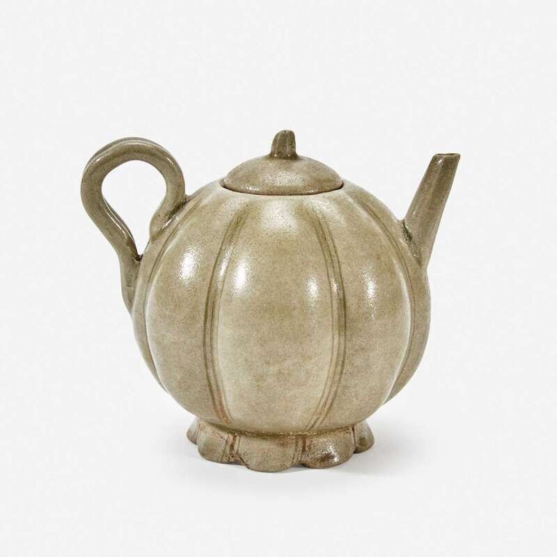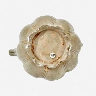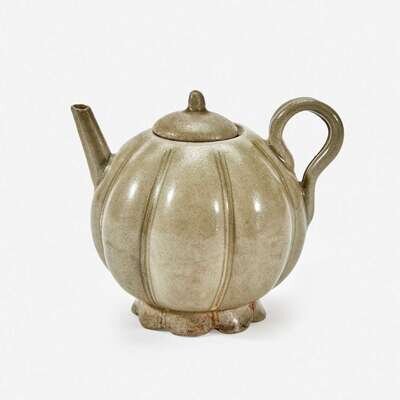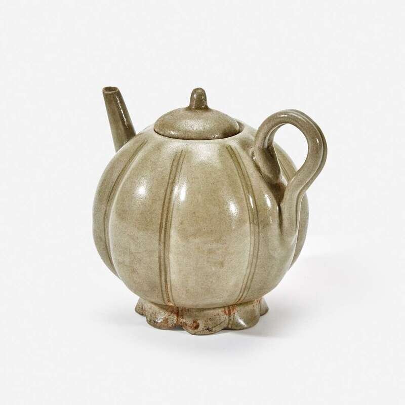 Possibly Yueyao, finely potted, the compressed spherical body lobed and applied with a spout and curved handle, raised on a short lobed foot. NOTE: This form is more commonly seen in Longquan celadons of the Southern Song dynasty, however, these are typically more robustly formed and less refined, such as the example illustrated in G. St. G. M Gompertz, "Chinese Celadon Wares", London, 1980, p. 165, no. 83A. See also "Chinese Celadons and Other related Wares in Southeast Asia", Singapore, 1979, pp. 196-197, nos. 158-160, and the Longquan example from the George and Mary Rockwell Collection at the Johnson Museum of Art, Cornell University, #80.113.010.