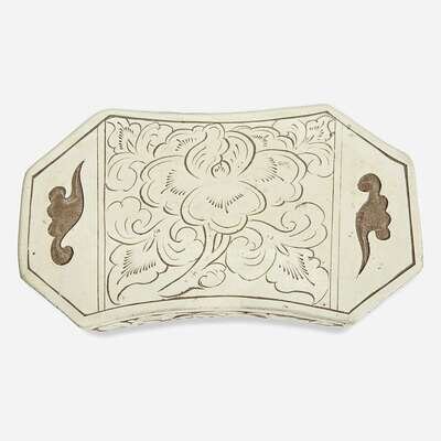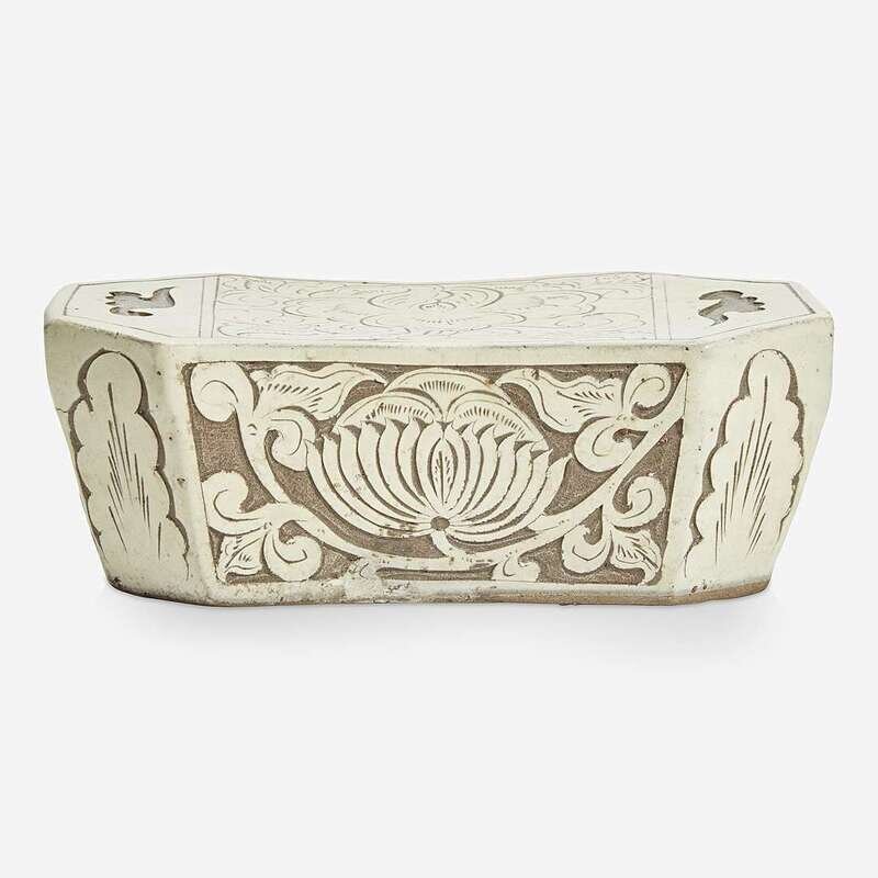 Of slightly curved octagonal ingot-form, carved through the creamy-white slip in low relief to reveal the darker grey-brown body; the top with peony spray and stylized clouds, the sides with stylized floral and foliate motifs, underside unglazed.