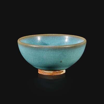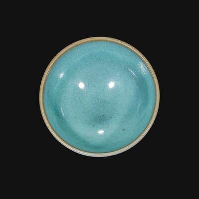 Well potted with deep rounded sides covered overall in a rich glossy sky-blue glaze fading to a mushroom tone around the rim, the glaze falling short of the foot revealing the red/brown-dressed body.