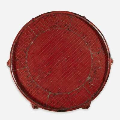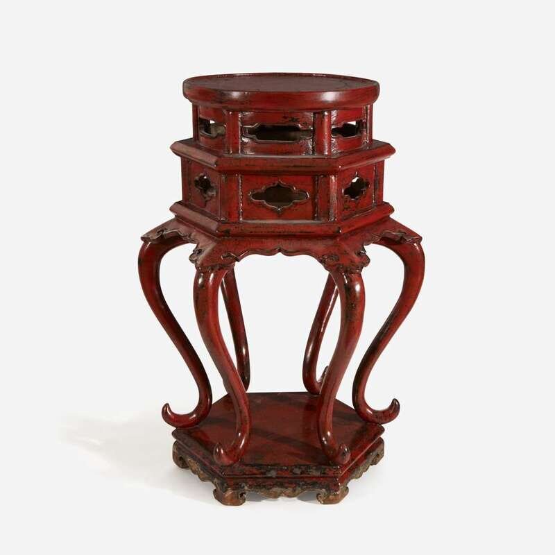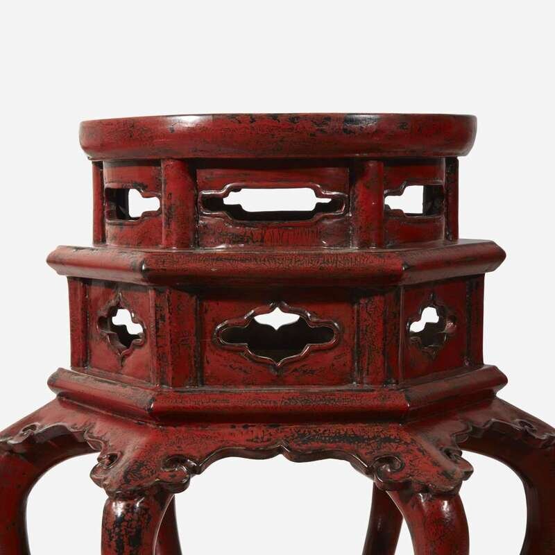 A Chinese or Japanese red lacquered Ming-style hexagonal incense stand
