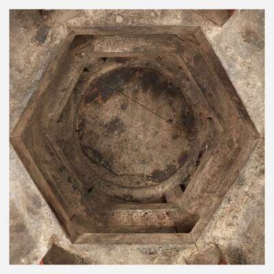 With two graduated tiers, the first of circular form, above a straight waist with pierced lobed reserves, the second tier of hexagonal form with conforming waist featuring similarly pierced lobed reserves, over a scrolled apron that extends to six cabriole legs with upturned feet, resting on a hexagonal pedestal, scroll feet.