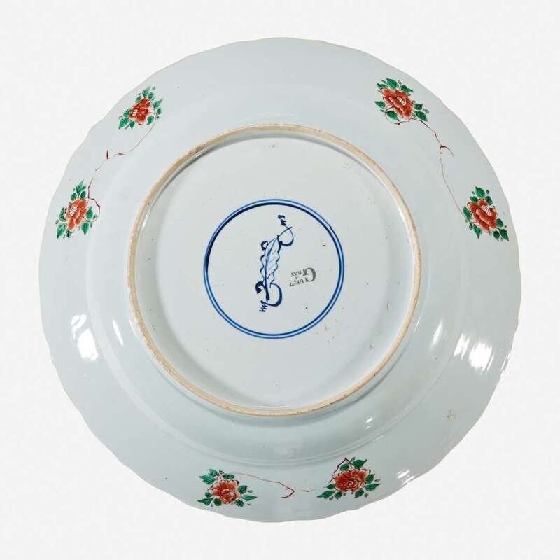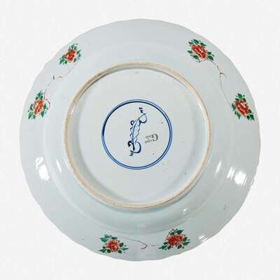 The center decorated with four reserves encircling a central reserve with qilin, each with various auspicious beasts, the rim decorated with floral and diaper reserves.