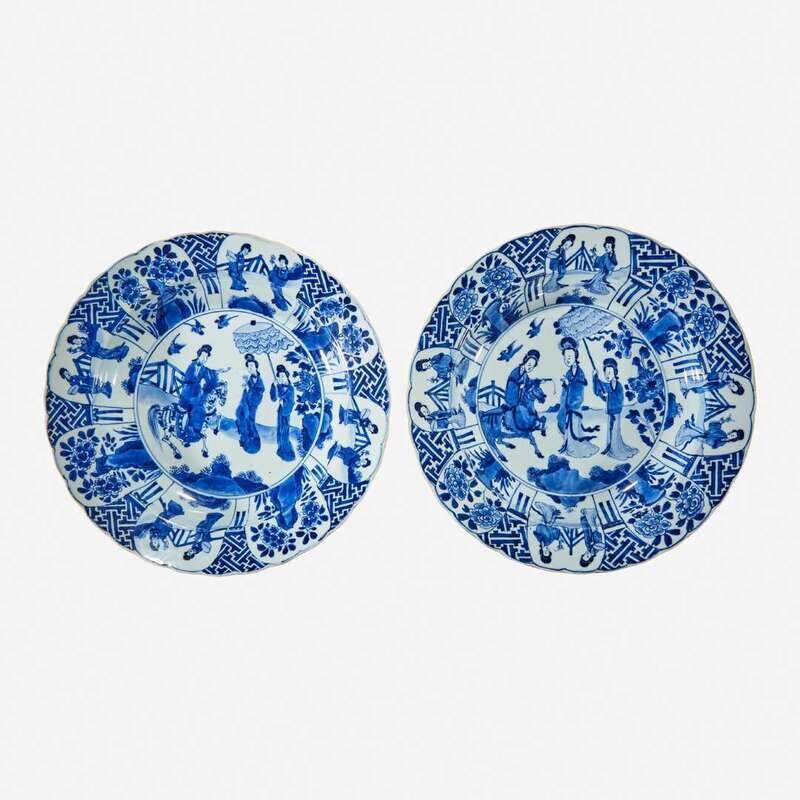 Each with shallow rounded sides and broad everted rim, rising from a short tapering foot, the interiors centered by a scene with two meiren and an equestrienne in a landscape, bordered by alternating panels of meiren and flowers against a fret ground, underside with ruyi heads and scrolled florets. underside inscribed "Da Qing Kangxi Nian Zhi" (2).