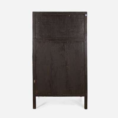 The rectangular cabinet with a pair of hinged doors composed of panels within rectangular frames, opening to reveal a shelved interior with two drawers, all beneath a display shelf, all supported on legs of square section joined by plain aprons and spandrels.