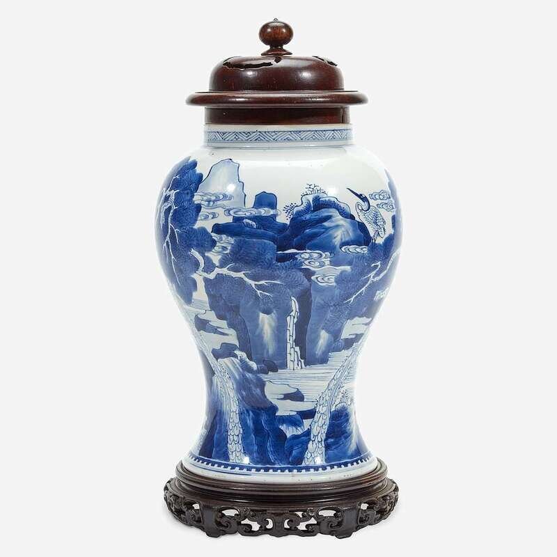 A Chinese blue and white porcelain vase with carved wood cover and stand The vase Kangxi period