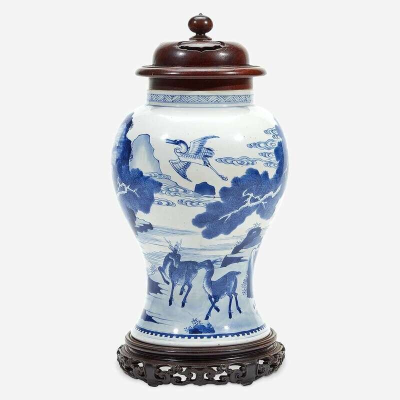 Of baluster form with reduced neck, the exterior decorated with deer and cranes in an extensive mountain landscape with pine, with a later carved wood cover and stand.