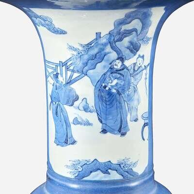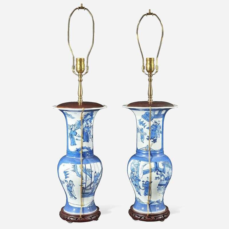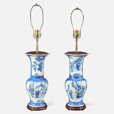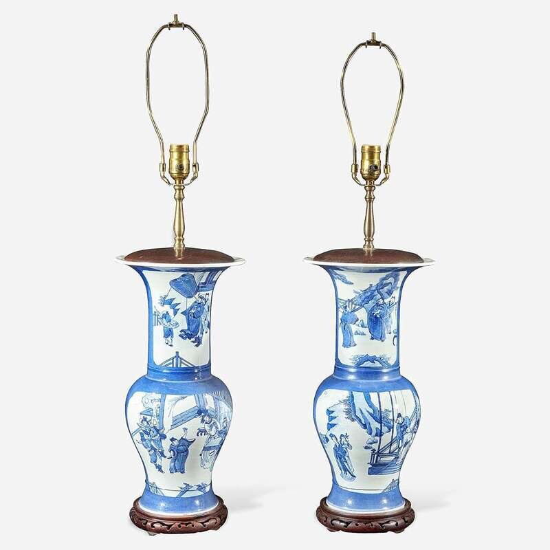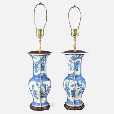 A pair of Chinese blue and white powder-blue ground “Phoenix-tail” vases mounted as lamps Kangxi style