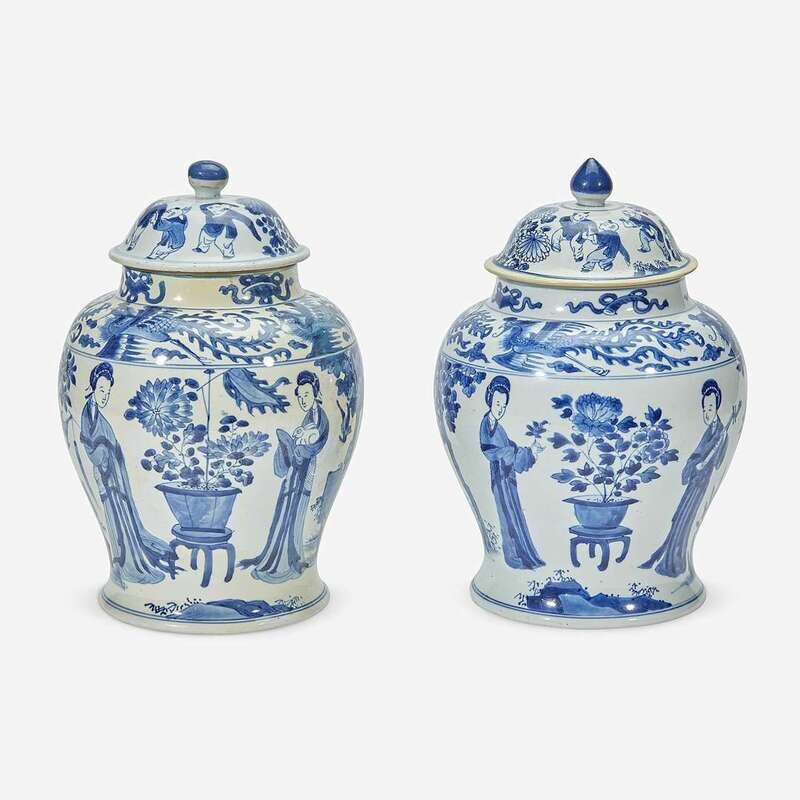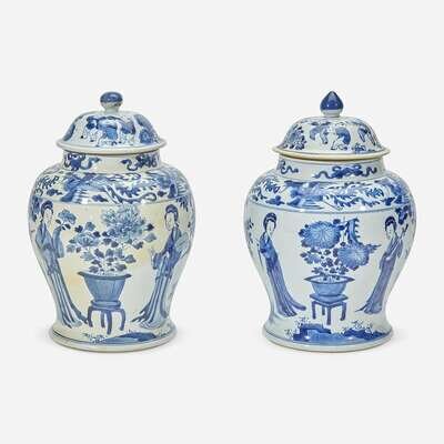 Each decorated with four Meiren, trees, rocks, and flowers on the body, four phoenix on shoulder, four auspicious symbols on neck, each cover depicting boys and flowers, undersides inscribed "Chenghua Nian Zhi" (2).