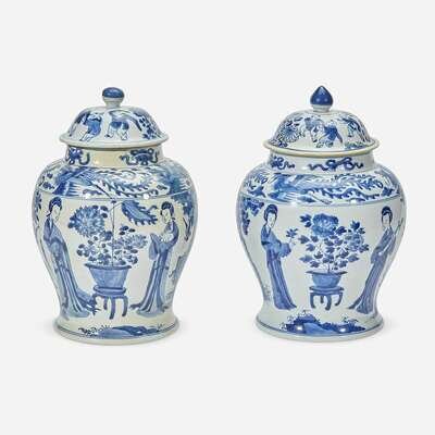 Two similar Chinese blue and white porcelain baluster jars and covers Kangxi period