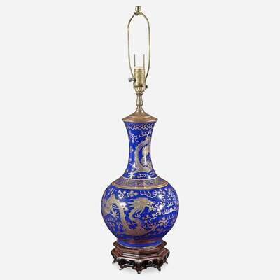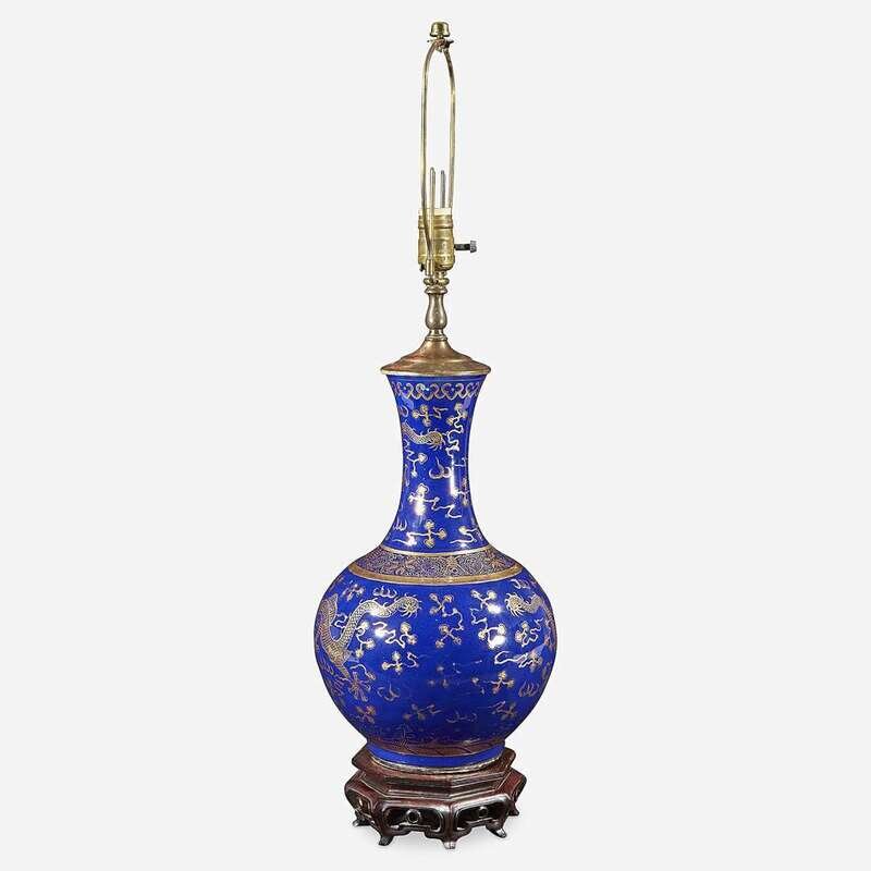 A Chinese gilt-decorated cobalt blue porcelain “Dragon” bottle vase, mounted as a lamp