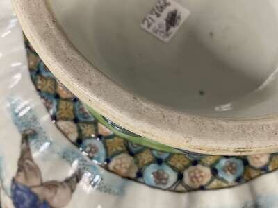 Decorated with boys in landscape to the interior, antiques to the rim; fighting warriors and a winged figure to the exterior, all above colorful wave panels on the foot.