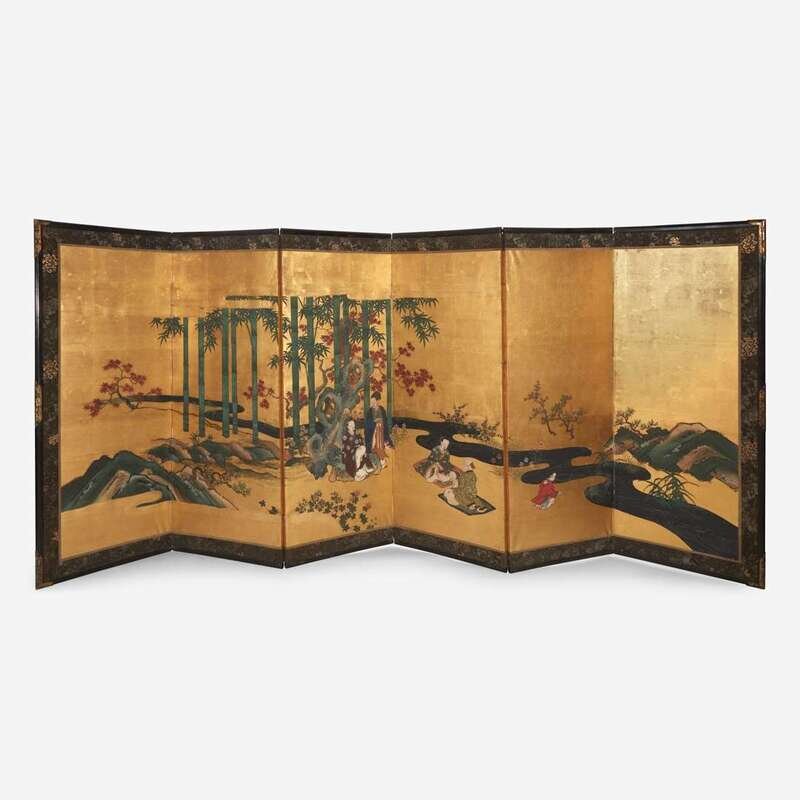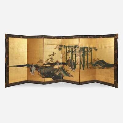 A pair of Japanese six-panel screens: "The Seven Scholars of the Bamboo Grove" Edo-Meiji period