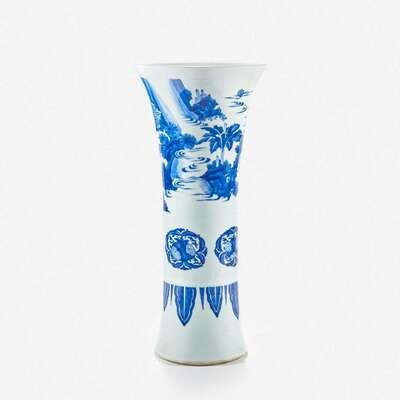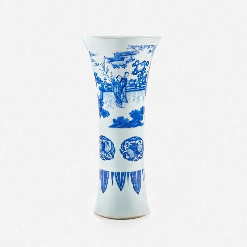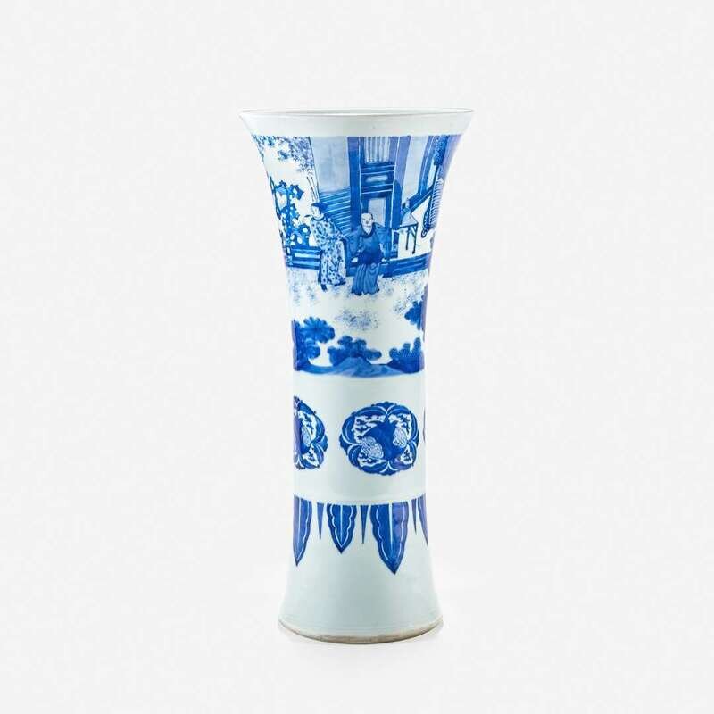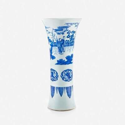 A large finely-decorated Chinese blue and white porcelain "Romance of the Western Chamber" gu-form beaker vase