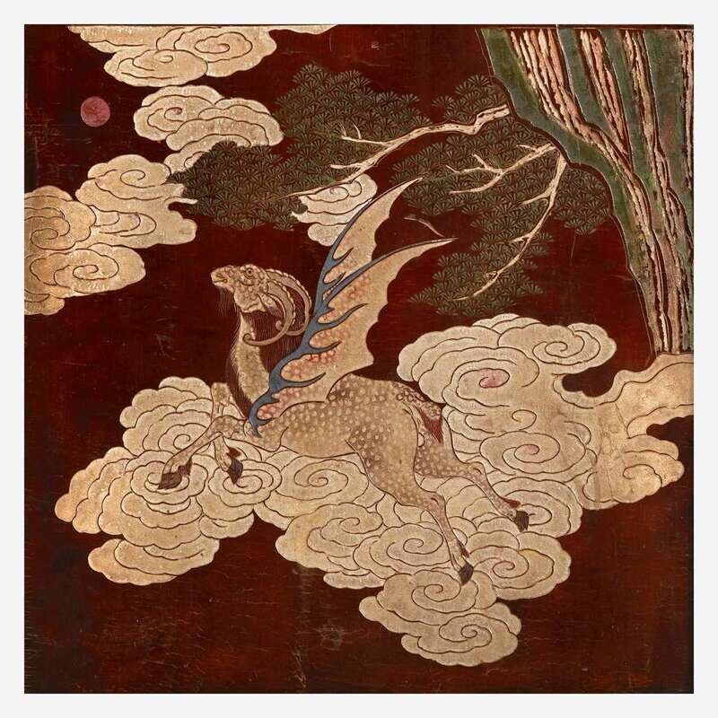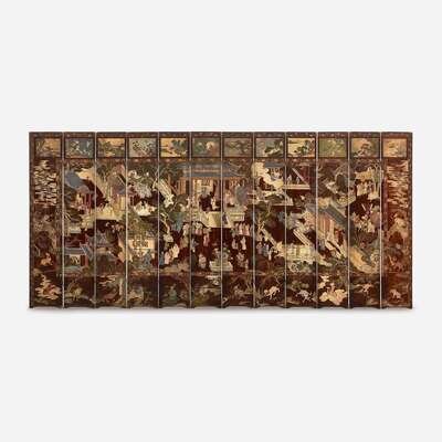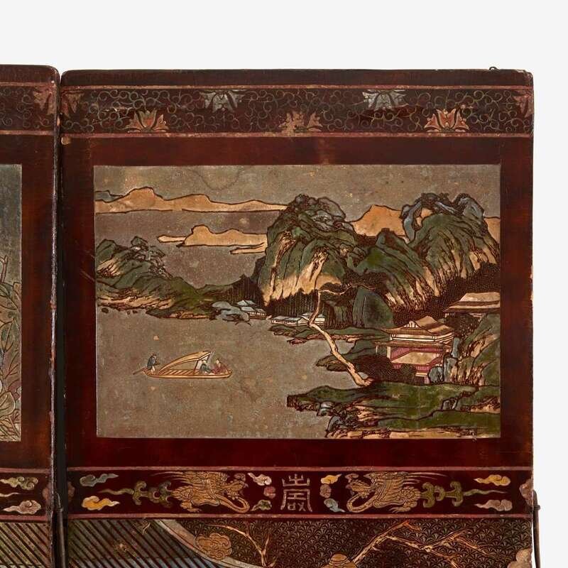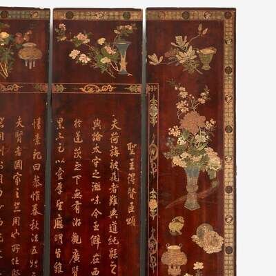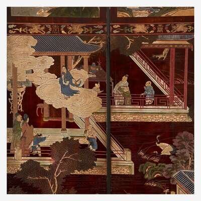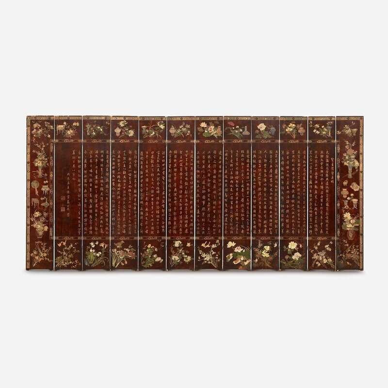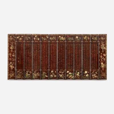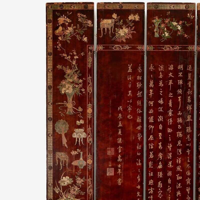 Finely carved and colored with numerous figures and immortals arriving to celebrate before an Emperor, among pavilions, gates, rockwork and lush vegetation, the upper panels depicting landscapes and bird and flowers, lower panels with animals, mythical and mundane, the side panels with additional auspicious beasts below sinuous dragons descending though scrolling clouds; the reverse with a lengthy calligraphic inscription with a transcription of Shengzhu de Xianchen song, which may be translated as "Ode to the Lord Who Has a Virtuous Minister/Subject," composed by Wang Bao of the Western Han dynasty. Further inscribed "Written by Marquis Gao Shinian in the first month of summer in the wu chen year (possibly equivalent to 1688). Two seals of the calligrapher Gao Shinian(?), and Si Yi(?); all bordered by reserves of flowers and antiques.