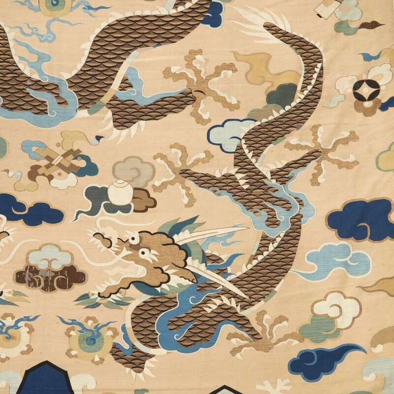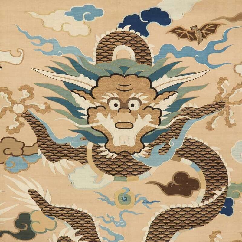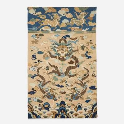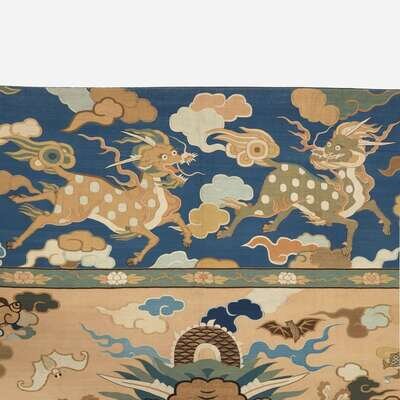Depicting a large sinuous five-clawed dragon in gold and colored thread above two smaller dragons over waves and rock-work, among colorful clouds and auspicious symbols. The upper register depicting two qilin among colorful clouds, a floral and scroll band below. Later dark blue canvas backing.