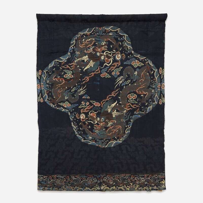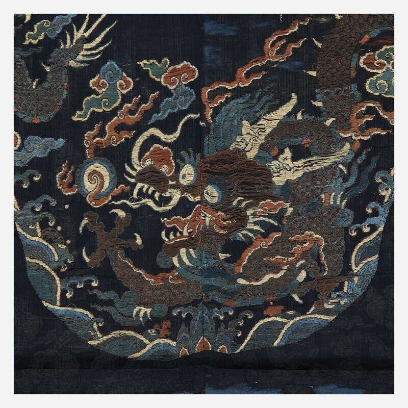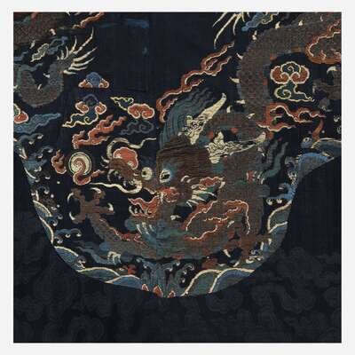 Of roughly cruciform design with two sinuous four-clawed "Mang" dragons pursuing a flaming jewel, among colorful clouds with ruyi-head forms, and rocks among waves, against a dark blue ground with a pattern of clouds, further dragons to upper and lower borders. NOTE: For a similar late 17th century panel, of brocaded silk gauze, for a Manchu formal court robe, see "Ruling from the Dragon Throne, Costume of the Qing Dynasty", p. 93, fig. 4.10. Such format where the dragons encircle the collar derive from robes of the Ming dynasty, such as that illustrated in the portrait of a Ming dynasty official, in Valery Garrett, "Chinese Dress from the Qing Dynasty to the Present", Hong Kong, 2007, p. 6, fig 1.