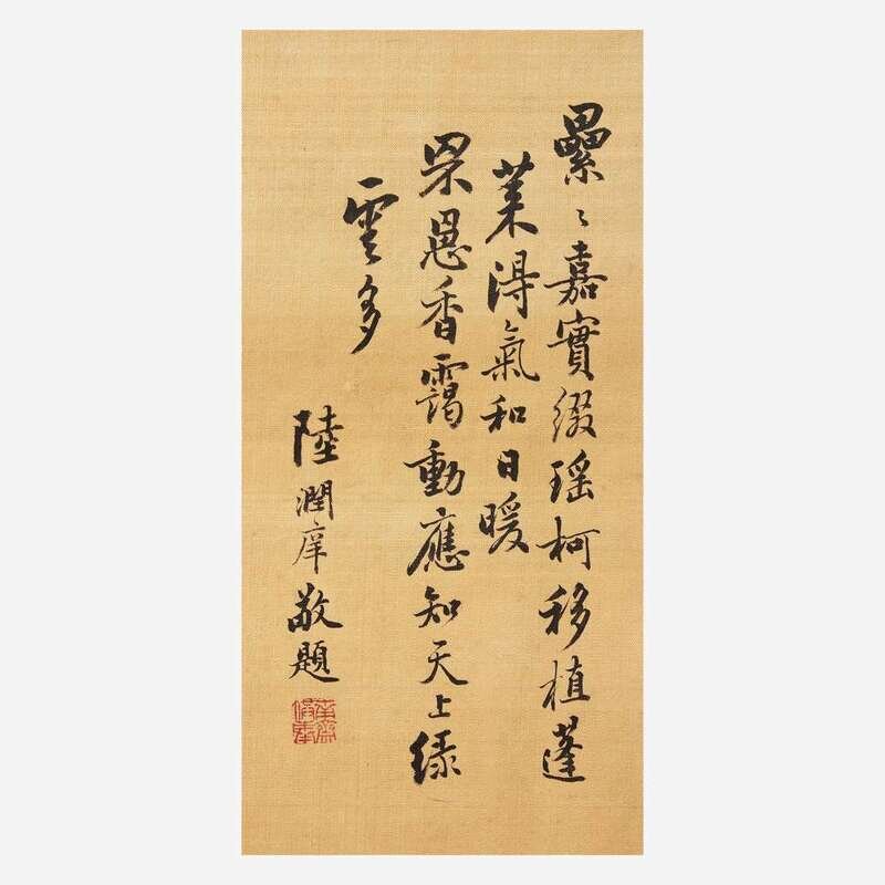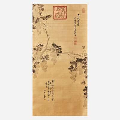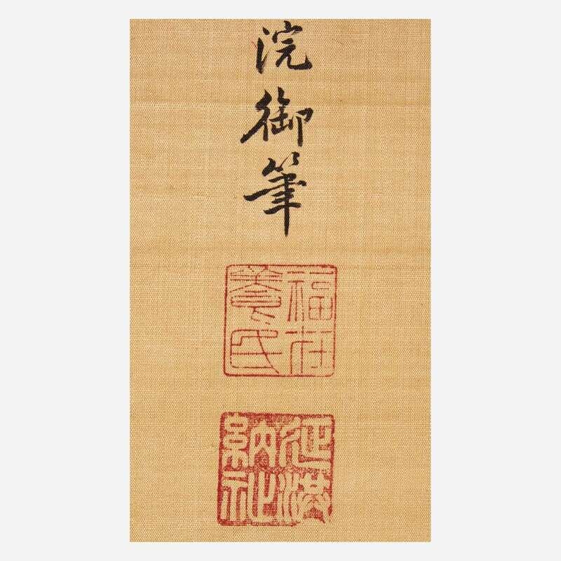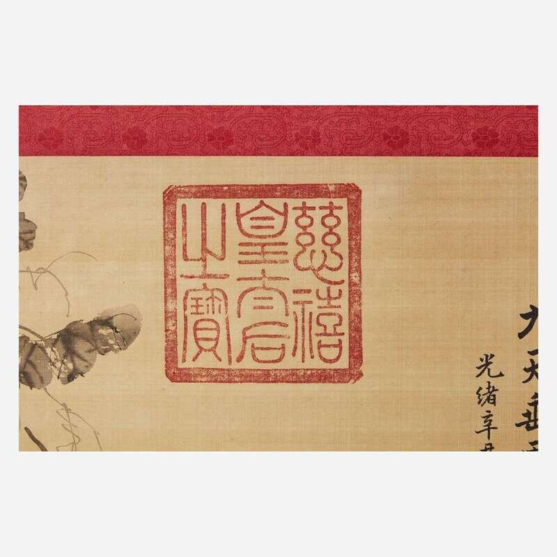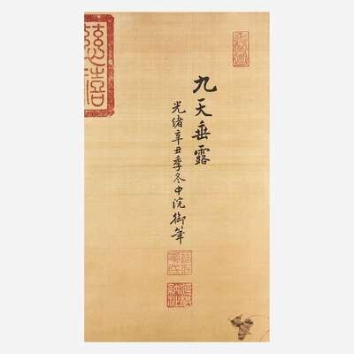 Ink on silk, mounted as a hanging scroll, titled and inscribed "Guangxu Xinchou Ji Dong Zhong Huan Yu Bi" ("Guangxu, Xinchou Year [equivalent to 1901-1902], Late Winter, Mid-Month; Imperial Brush") upper right and with four seals, inscribed again lower left with a poem signed Lu Runxiang, and with one seal; later Japanese style mounts, later wood box, accompanied by Sarah Pike Conger "Letters from China", Chicago, 1909 (2).