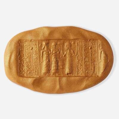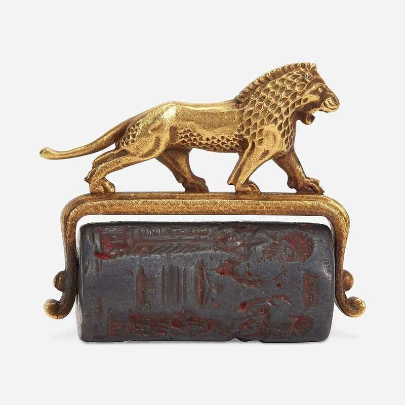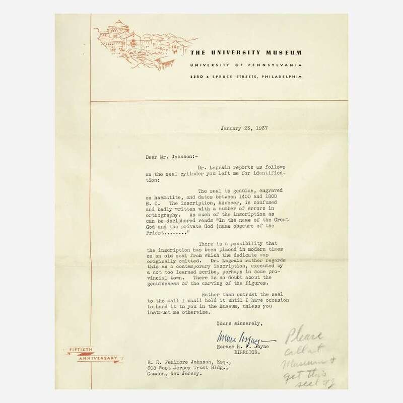 The seal, carved with figures and cuneiform, with later gold lion-form mount; according to an accompanying letter from Horace H. F. Jayne, Director of the Museum of the University of Pennsylvania, with reference to research by Dr. Leon Legrain, D.D., Sc.D, the curator of the Babylonian section of the museum, and addressed to E. R. F. Johnson, dated January 23rd, 1937, the inscription may read "In the name of the Great God and the private God (name obscure of the Priest)..."