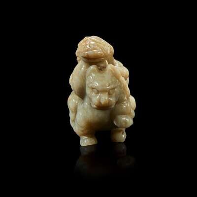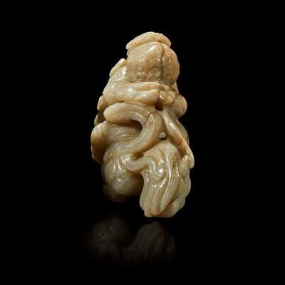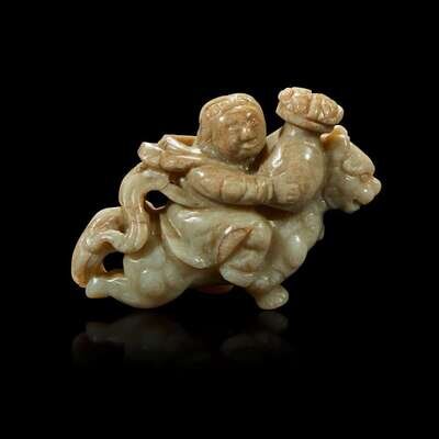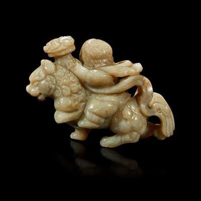 A Chinese greyish white jade carving of a foreigner on a mythical beast 18th Century or earlier