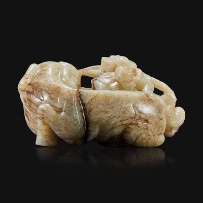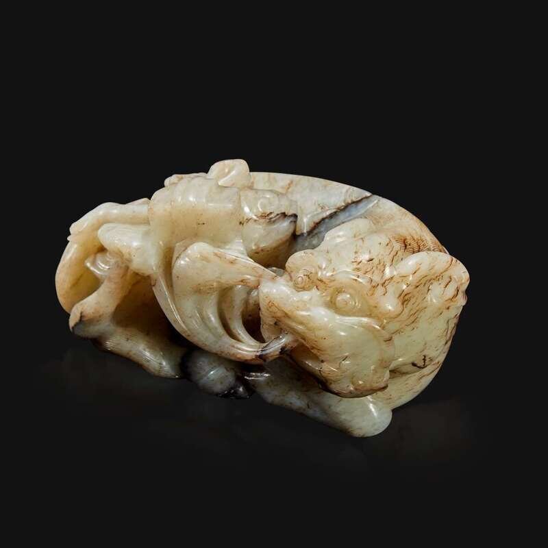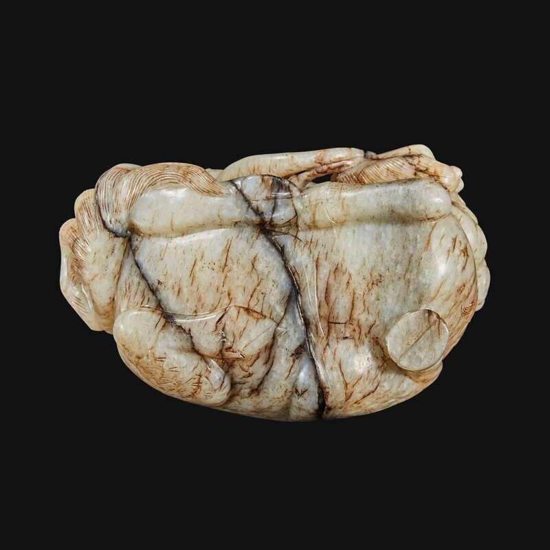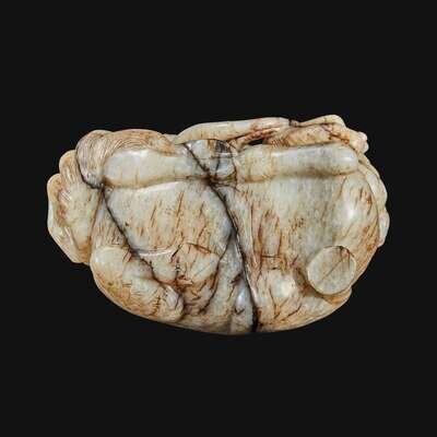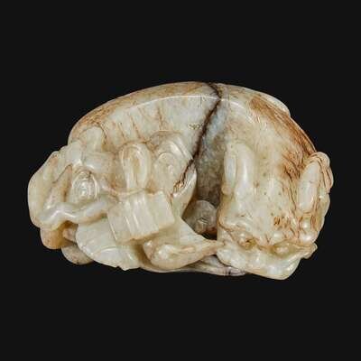 A scroll issuing from its mouth, on which are a scarf-wrapped pile of books, the jade with beige and dark brown/black veining.