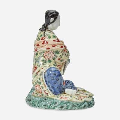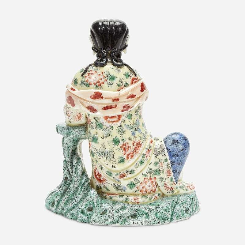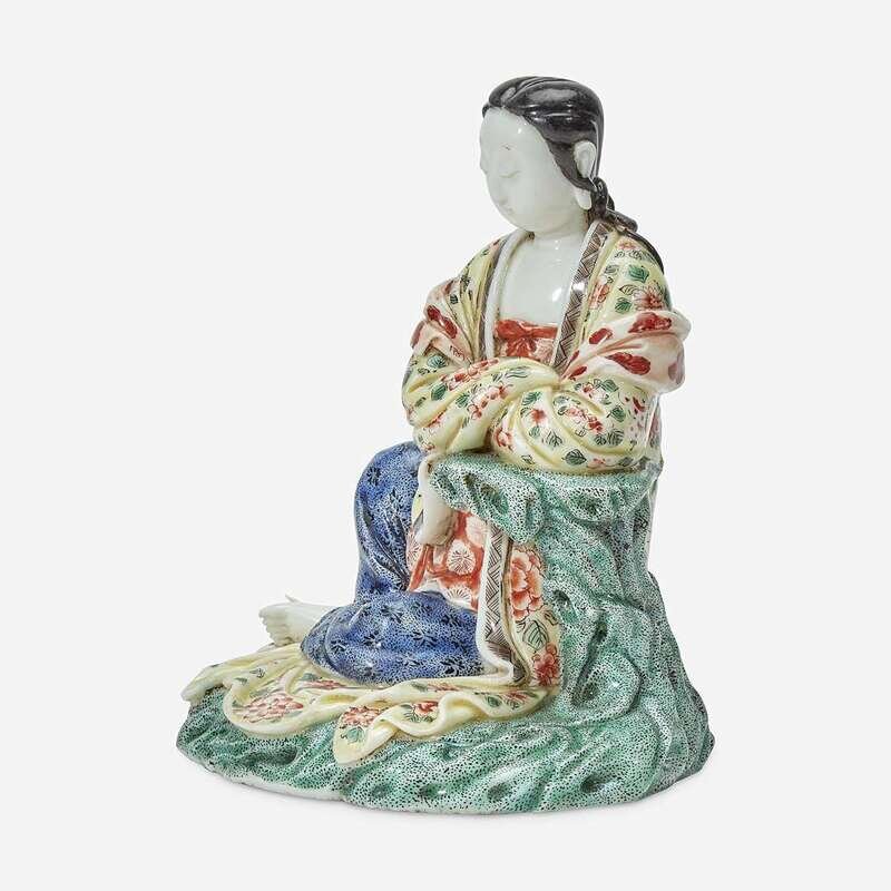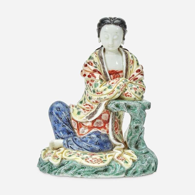 The female deity gracefully modeled, depicted seated at "Royal Ease", leaning upon a rockwork stand, adorned in a flowing blossom-patterned robe.