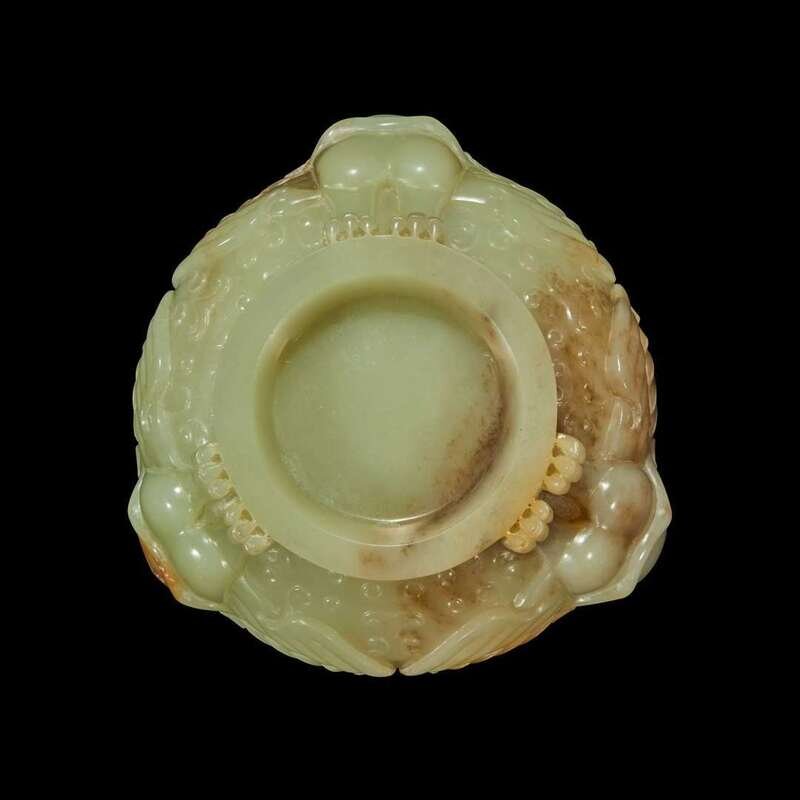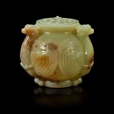 A Chinese carved greyish celadon and beige jade archaistic "Birds" vessel and cover Qing Dynasty, 18th/19th Century