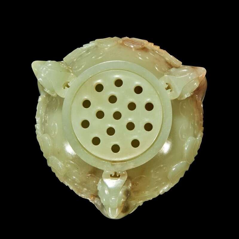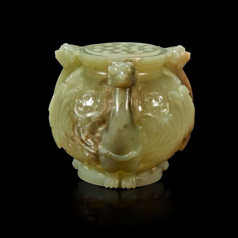 Decorated with three finely carved front-facing phoenix with spread wings holding a jewel in each beak, archaistic cloud scrolls patterns along surface; lotus pod-carved loose circular cover, the foot pierced with three apertures.