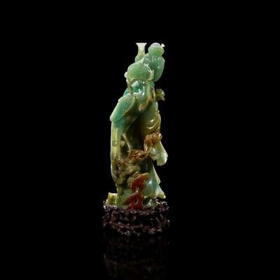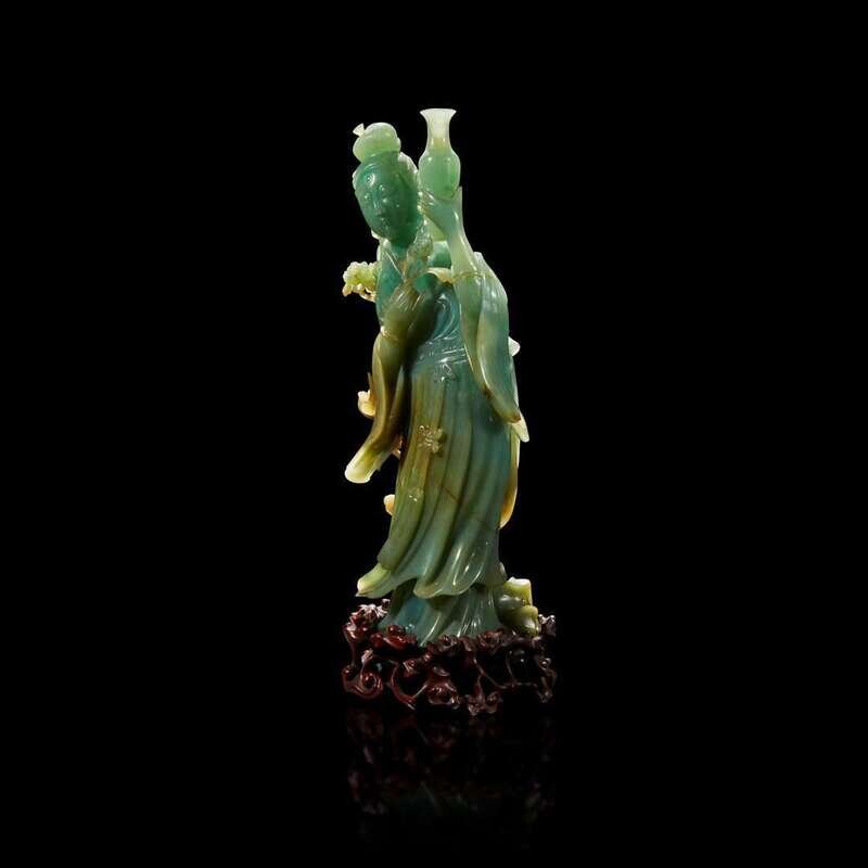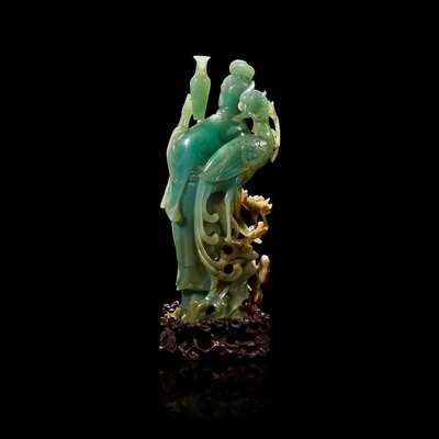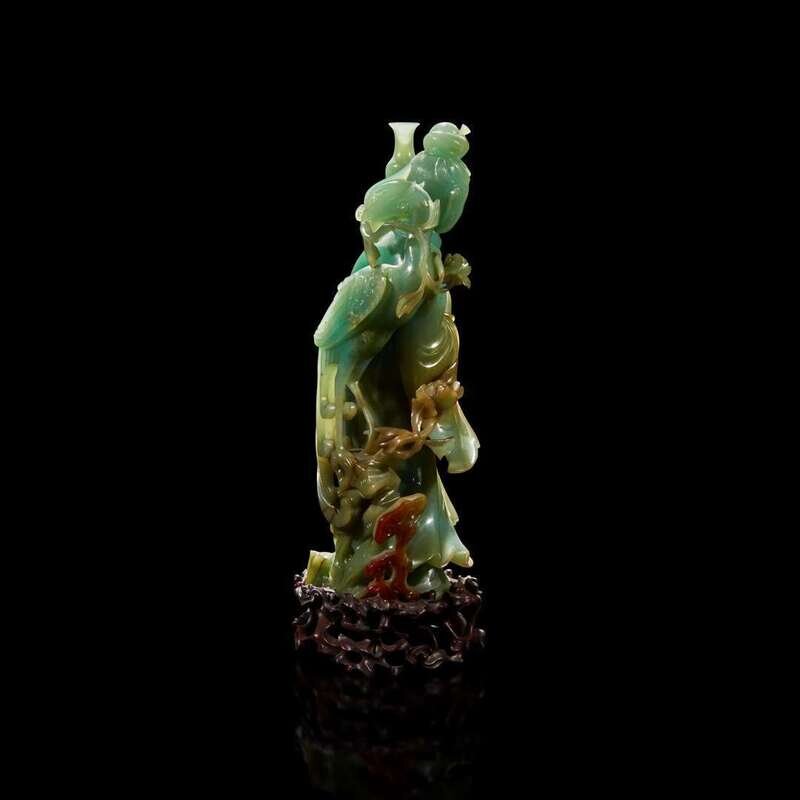 Depicted draped in a flowing robe, fluttering at the sleeves and hem, her hair pulled into a high chignon, delicately bearing a slender baluster vase, in front of a phoenix perched atop a blossoming stem, rockwork and lingzhi spray, the stone of an attractive green with traces of russet, some cleverly incorporated into the carved motifs; with a pierced carved wood stand.