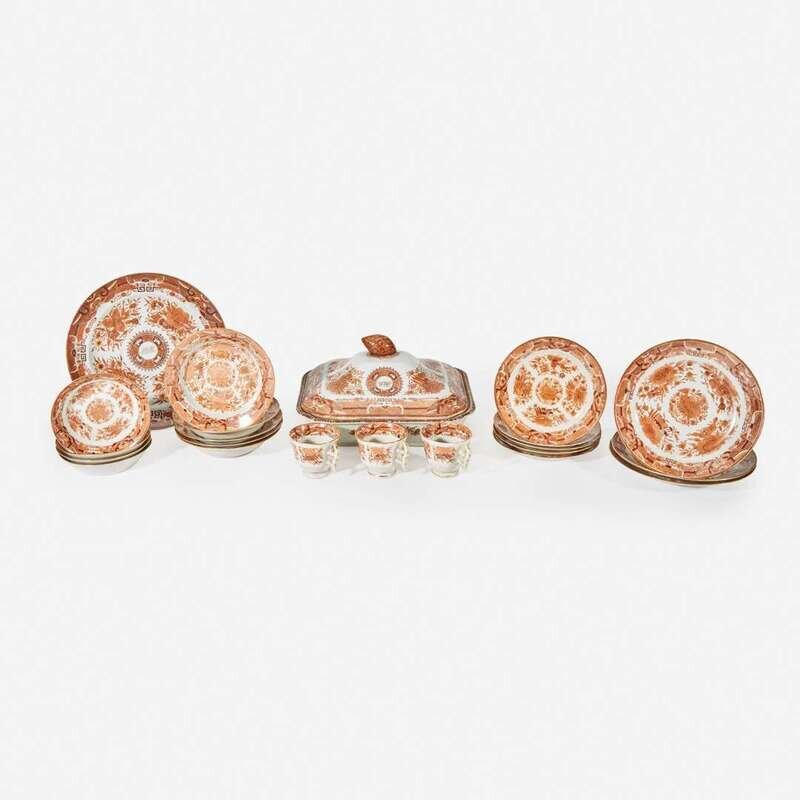 Comprising a covered vegetable dish and dinner plate, both with monogram "WMW"; three luncheon plates; five large saucers; four small saucers; five bread plates; and three teacups.