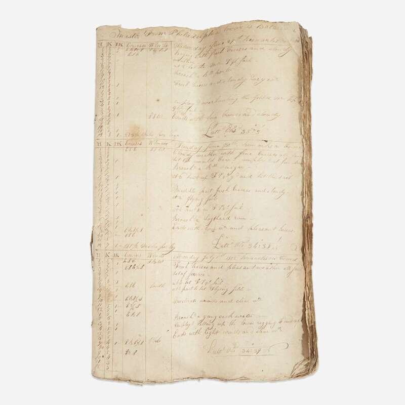 Tall folio, 56 leaves, self wrappers. Logbook, written entirely in MS., for the Brig, Lovely Lass, commanded by Captain Jno. (Jonathan) B. Hodgson, on its route to the capital of the Dutch East Indies, Batavia (now Jakarta, Indonesia). Recording daily weather conditions, wind patterns, course directions, cargo shipments delivered and received, as well as some interactions between the crew, including an incident on Sunday March 23, 1806, involving a "quarrel".
