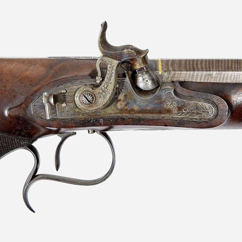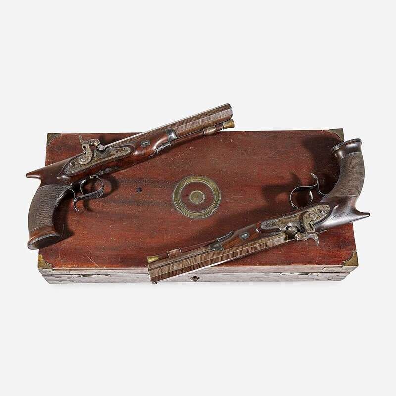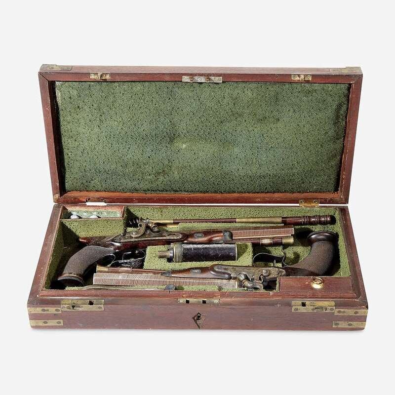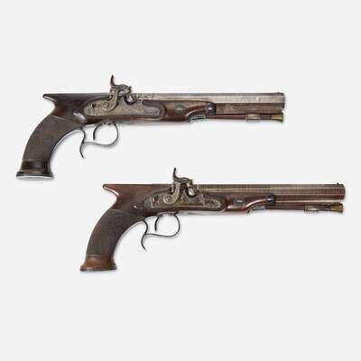 Manufactured in percussion, walnut half stocks in early “Saw Handle” form with finely checkered grips, the locks are engraved "Vallée/ Chaplain," and show an early percussion design style with extensive engraving also found on all of the silver furniture, sliding safety behind each hammer; the 3/4 inch octagonal barrels with a double brass inlaid line at the breech and retain original Damascus brown finish, and under rib for the original ramrods engraved "London," smooth bore; mahogany case retaining original felt lining and accessories: cleaning rods, bullet mold, powder flask, and others.