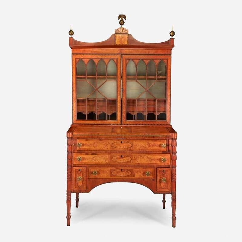 A Federal carved and inlaid mahogany and flame birch secretary Manner of William Hook (1777-1867), Salem, MA, circa 1815