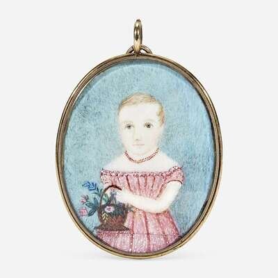 American School 19th century Portrait Miniature of a Young Girl in a Pink Dress Holding a Basket of Flowers