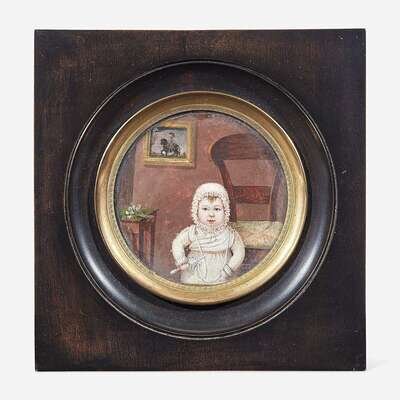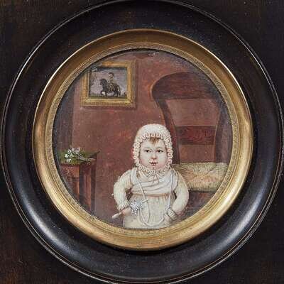 Continental School 19th century Portrait Miniature of an Interior with Small Child Holding Rattle