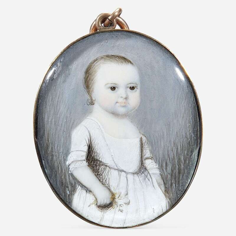English School 18th century Portrait Miniature of a Young Child in White Dress Holding Flowers