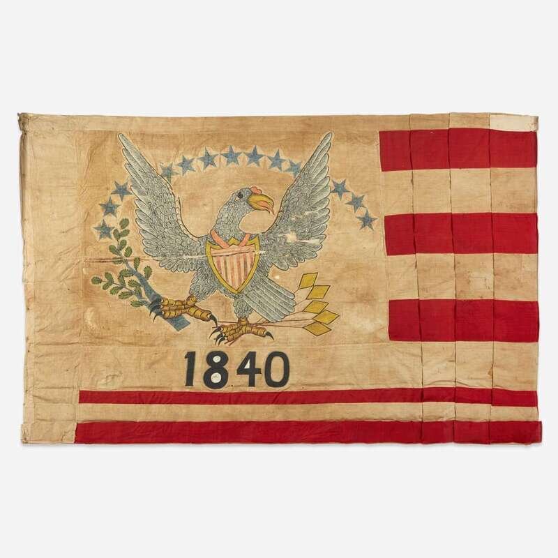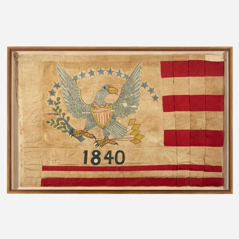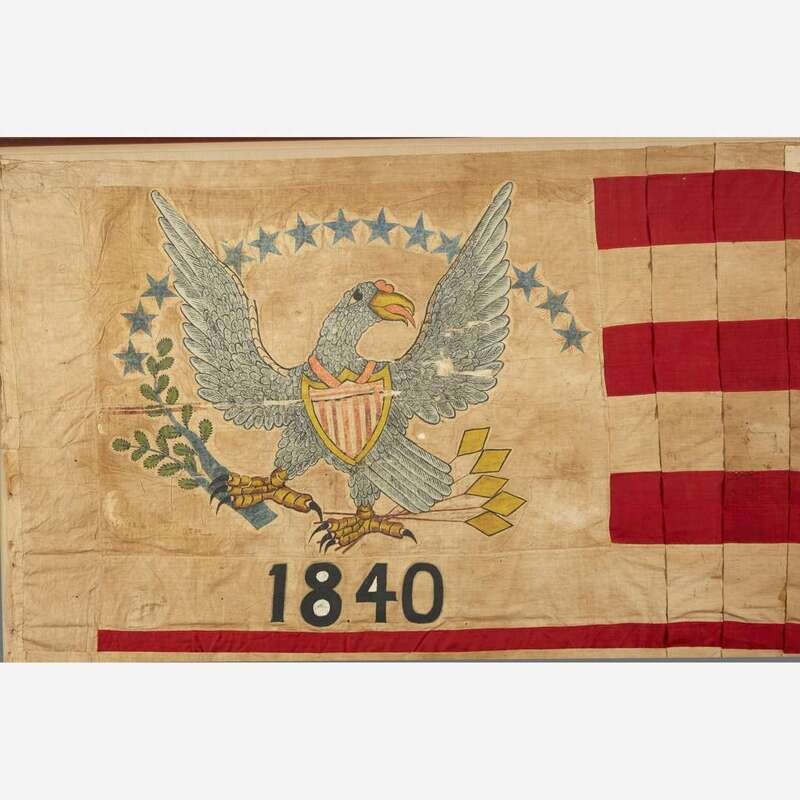 Emblazoned with a hand-painted eagle with outstretched wings, clutching branch and arrows in talons, beneath an arc of blue stars and above the hand-painted date, "1840," on a cotton canton, 10 hand-sewn wool and cotton stripes, cotton hoist, mounted and framed.