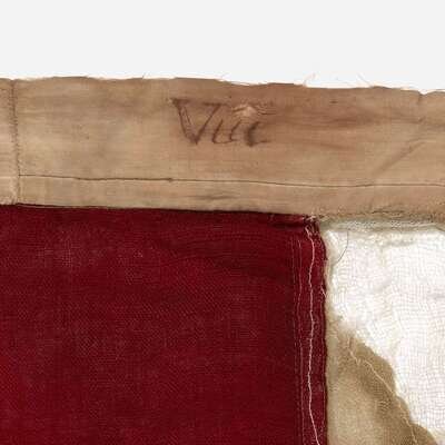 Double appliqued hand and machine-sewn stars, machine-sewn wool bunting, linen header with hand-stitched grommets with brass ring on other side, the header inscribed in ink "Viti."