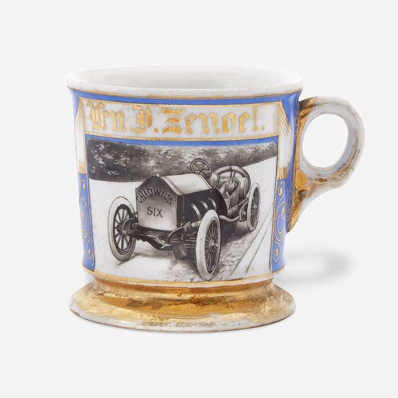 Enamel decorated, depicting the race car "Chadwick Six," gilt inscription, "Len J. Zengel," with gilt highlights; marked to underside "Alpina" (?).