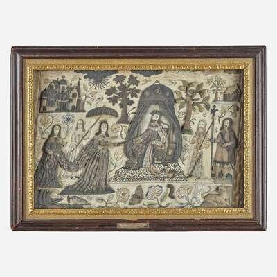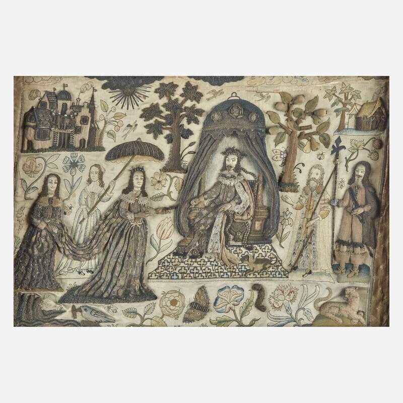 Elaborately worked, the Biblical figures depicted as Charles I and his consort Henrietta Maria in contemporary dress, surrounded by courtiers and attendants in a lush landscape, with sun, trees, fruit, flowers, buildings, and various animals: lion, dog, birds, and insects; frame with later silver plaque engraved, "Stuart Needlework from Wroxton Abbey."