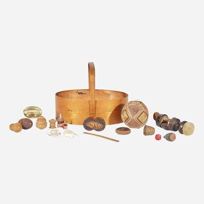 A Shaker bentwood sewing box together with various accessories The Shaker box stamped "Sabbathday Lake Shakers/SC Trademark/ Maine," 19th century