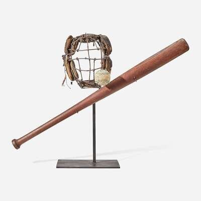 A baseball assemblage: early bat, catcher's mask, and practice ball late 19th to mid 20th century