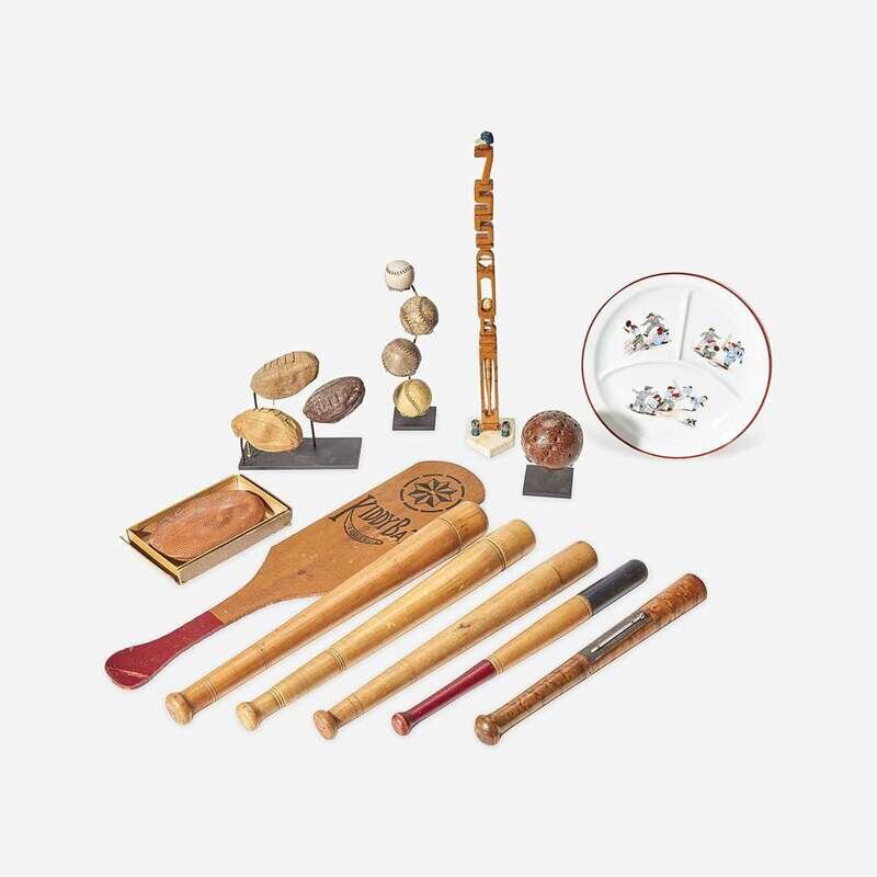 Including four miniature baseballs mounted for display, four turned wooden baseball bat-shaped pencil cases, one painted with red and blue ends, another bearing the printed paper label, "BonBons Fins/Maron/1614 Chestnut St./Phila.," a bird's-eye maple miniature bat fitted with a thermometer, a "Kiddy Bat/for Rubber Balls," a glazed sewer tile baseball mounted on a stand, a Japanese child's porcelain plate decorated with transfer printed baseball scenes, a folk carved and painted wooden tribute to Hank Aaron (1934-2021) of the Atlanta Braves and 755 home runs, and three miniature leather football-shaped change purses and a larger football-shaped "Spalding" trademarked change purse in early box.