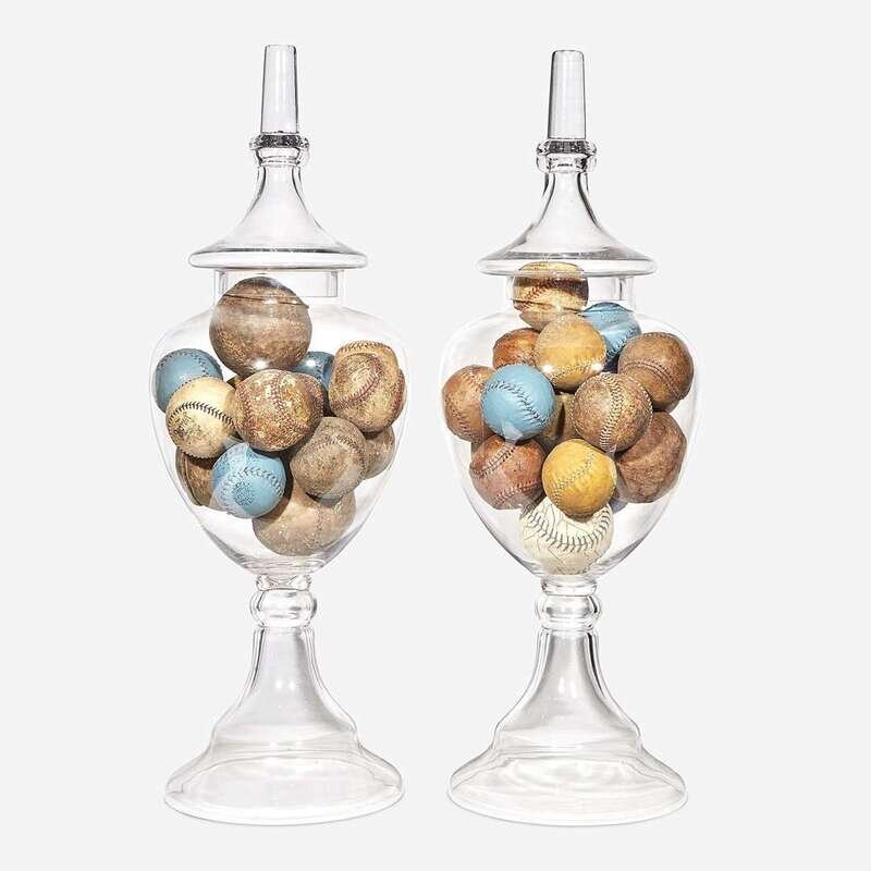 Two uncolored glass apothecary jars filled with baseballs 20th century