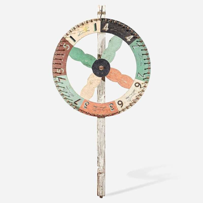 A painted carnival wheel with stenciled figures of Pit bulls first half 20th century