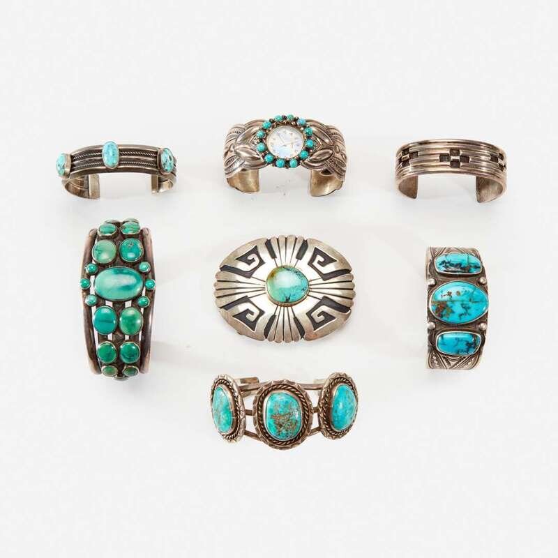 A group of Navajo silver and turquoise bracelet/cuffs and a belt buckle 20th century