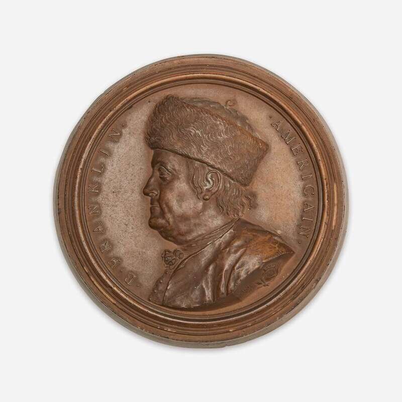 Inscribed, "B. FRANKLIN AMERICAIN, " the sitter wearing a fur cap, impressed with crest, signature and date, "1777."