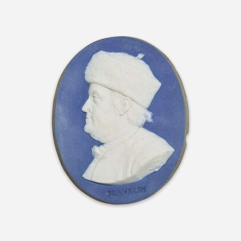 A Wedgwood & Bentley blue and white Jasperware portrait medallion of Benjamin Franklin (1706-1790) After Jean-Baptiste Nini (Italian, 1717-1786), Etruria, Staffordshire, circa 1780