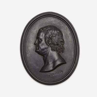A Wedgwood & Bentley black basalt portrait medallion of Benjamin Franklin (1706-1790) Modeling attributed to William Hackwood, Etruria, Staffordshire, circa 1780